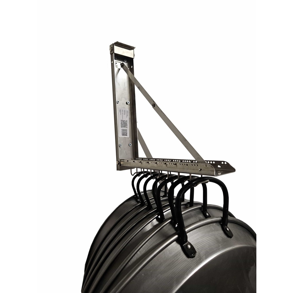 Tenga en cuenta que las argollas de sujeción pueden ser manipuladas, en caso de que tengamos menos paellas que las 8 argollas, podemos quitarlas o moverlas para adaptarlas a las cantidades y tamaños de paellas que queramos guardar.
