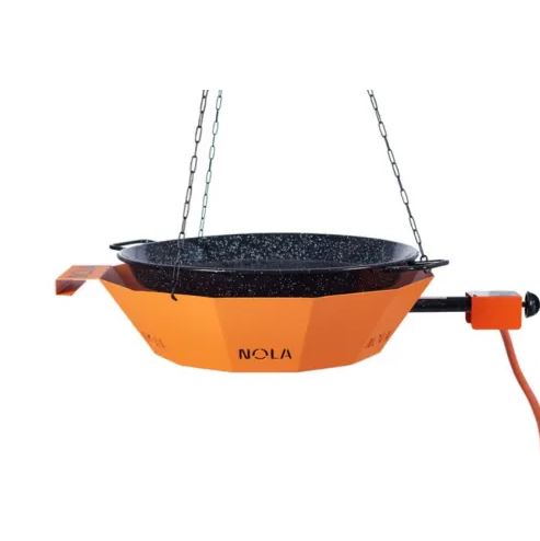 El sistema Nola es una herramienta innovadora para cocinar paellas con un objetivo muy claro en mente: cocinar paellas y otros platos en nuestro propio barco. Su enganche permite colgarlo en un punto fijo, evitando su contacto con la superficie del barco y su diseño permite mantener nuestra paella, sarten o parrilla de forma estática dentro de si, dándonos en el proceso una cocina de suspensión que se ve mínimamente afectada por el vaivén de las olas o el balanceo del barco.