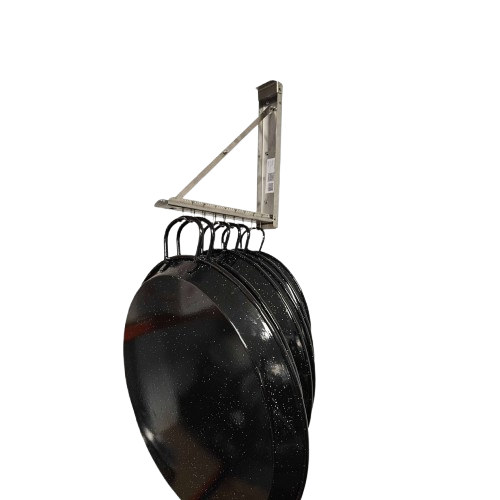 Guarda hasta 8 paellas ocupando el espacio de solo 1. El Paella Magic Store o colgador de paellas extensible es una herramienta para los mas aficionados a la paella o aquellos que quieren tener todo ordenado en su cocina. Debido a su diseño, podemos colocar nuestras paellas de menor a mayor en este y, una vez flexionado para que se cierre, la paella mas grande resguarda a las mas pequeñas, ocupando así solo el tamaño de 1 paella cuando guarda múltiples dentro de la paella mas grande.