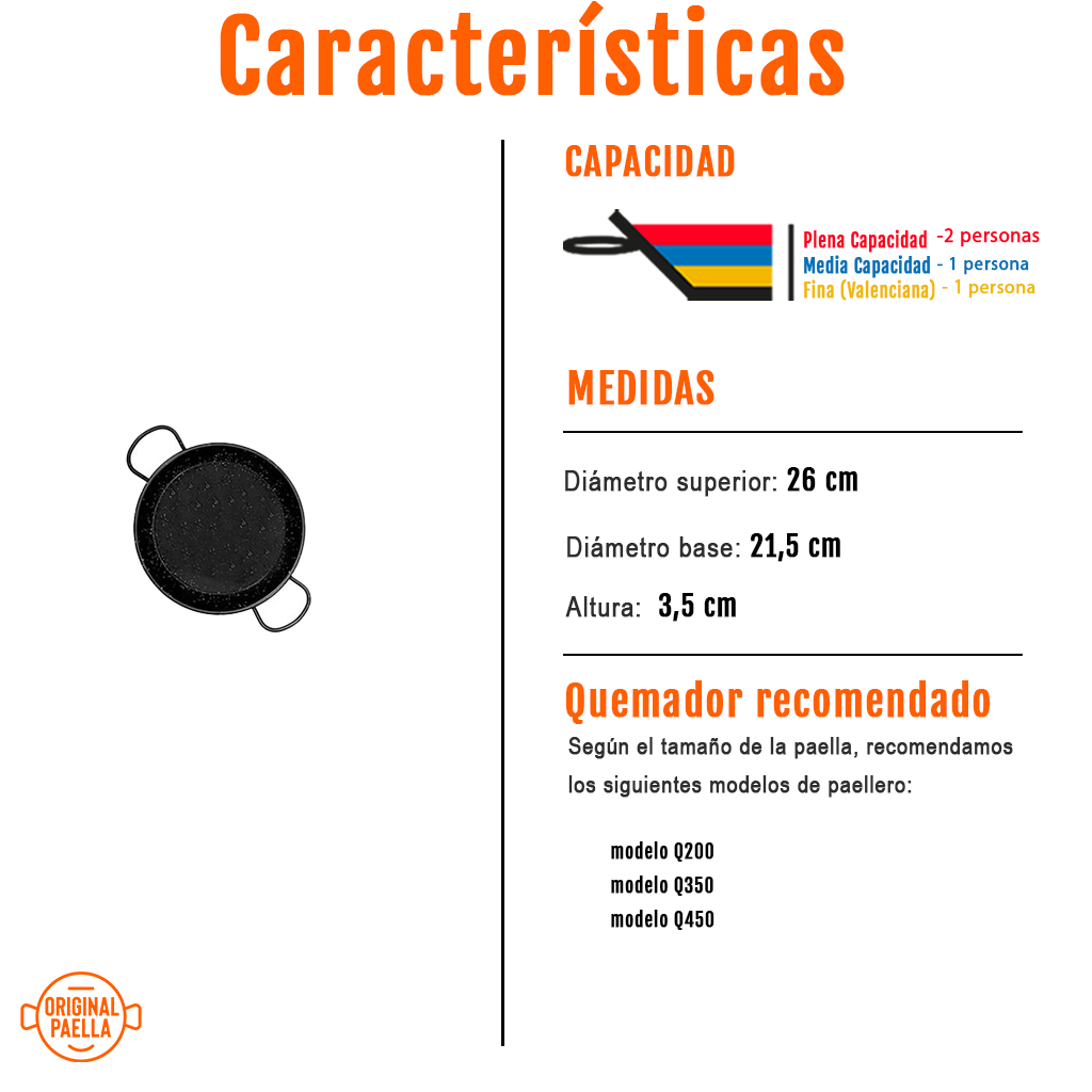 - Paella esmaltada de 26 cm, fácil de limpiar y sin mantenimiento.